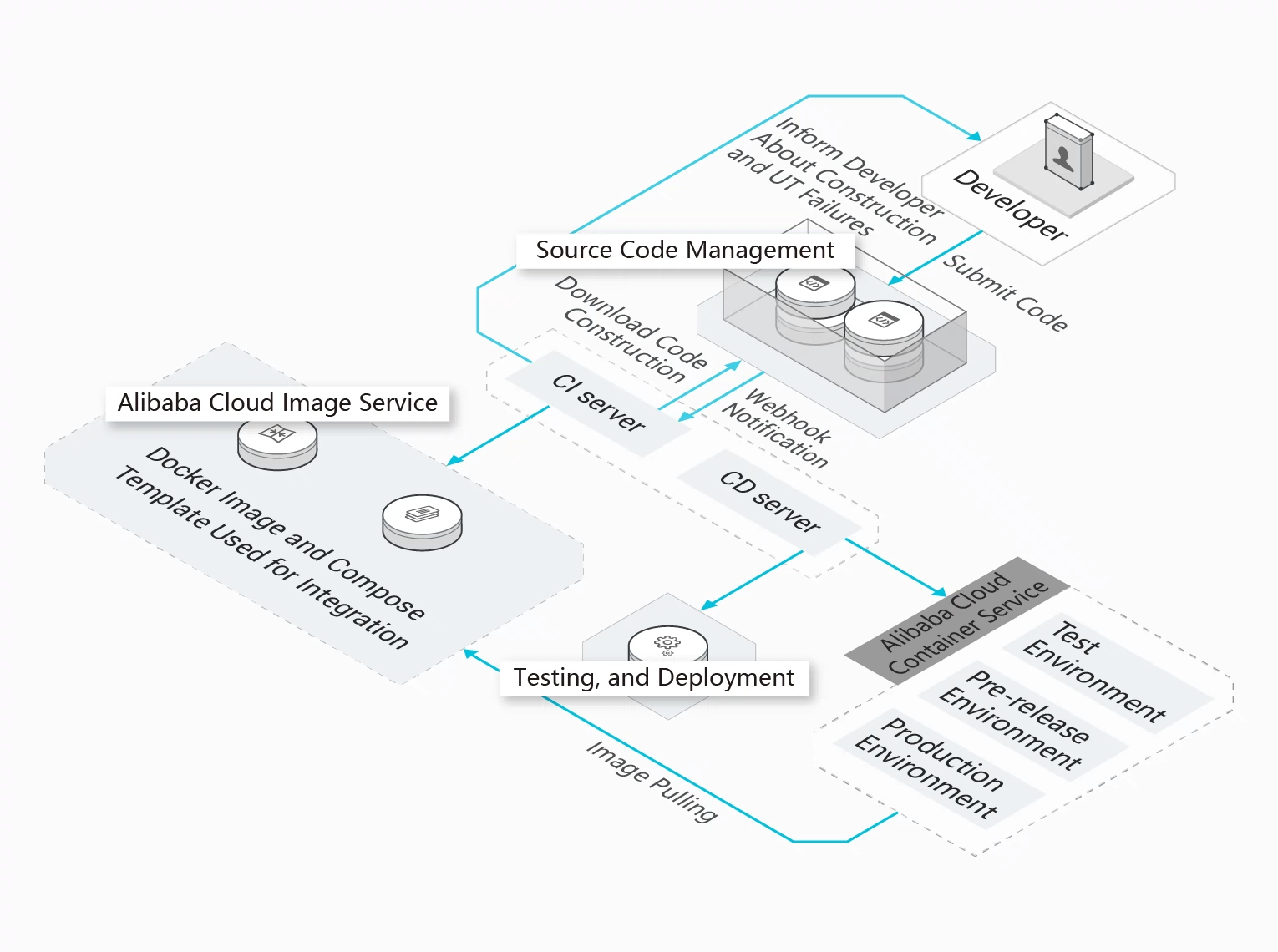 Container Service for Kubernetes và Jenkins có thể hoàn tất quy trình DevOps từ việc gửi mã đến việc triển khai ứng dụng mà không cần thao tác thủ công. Chỉ có mã đã được kiểm tra tự động mới có thể được phân phối để triển khai. Điều này cho phép bạn thoát khỏi các chế độ phân phối truyền thống vốn có quy trình triển khai phức tạp và tốc độ lặp lại ứng dụng chậm.