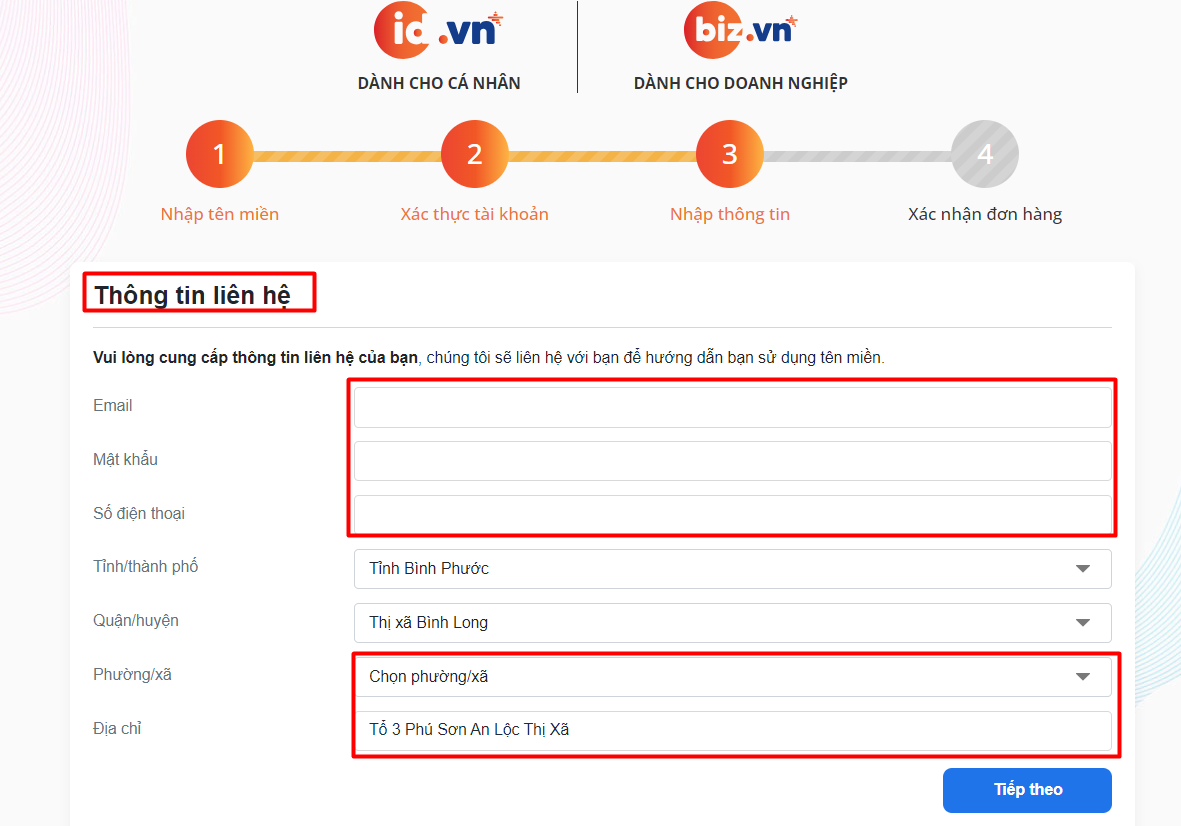 Sau đó, bạn nhập thông tin tên miền cần đăng ký vào form sau: