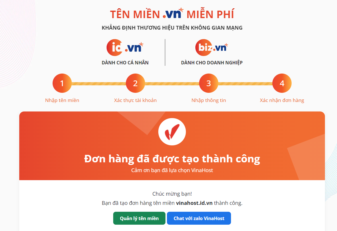 Tên miền sẽ được đăng ký tự động sau khi hệ thống kiểm tra thông tin đăng ký hợp lệ và đáp ứng đủ điều kiện liên quan đến chính sách ưu đãi miễn phí tên miền .id.vn. Đơn hàng được tạo thành công sẽ hiển thị thông báo sau: