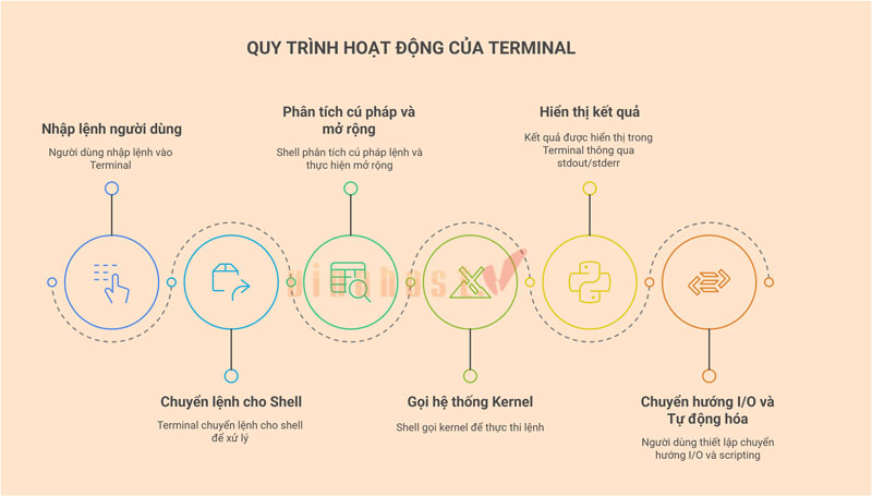 - Xử lý bởi Shell: Terminal chuyển lệnh cho shell, shell phân tích cú pháp, thực hiện mở rộng biến và ký tự đại diện.