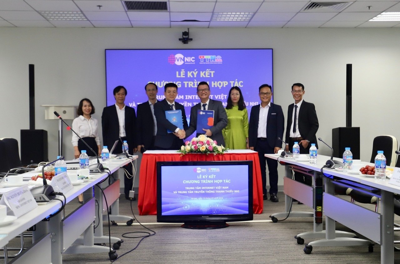 Tại Hà Nội, chiều 19/7/2024, Trung tâm Internet Việt Nam (VNNIC) – Bộ Thông tin truyền thông và Trung tâm Truyền thông Thanh thiếu nhi (TTTTN) – Trung ương Đoàn đã tổ chức lễ ký kết phối hợp các hoạt động tuyên truyền, ứng dụng tên miền quốc gia “.vn” và nâng cao năng lực số cho thanh thiếu niên. Ông Nguyễn Hồng Thắng – Giám đốc VNNIC và ông Lê Duy Hưng Thịnh – Quyền Giám đốc Trung tâm truyền thông TTN chủ trì buổi lễ.